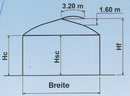 Breite 9,60 m oder 8 m Rinnenhöhe3,5m -4 m - 4,5 m - 5 m Pfostenabstand 5 m -Binderabstand 2,5 m Binder und Zwischenbinder mit Zick - Zach - Verstärkung. Diese Kostruktion entspricht der EU - Norm EN13031 und ist für alle europäischen Zonen, sowie andere identische Regionen berechnet